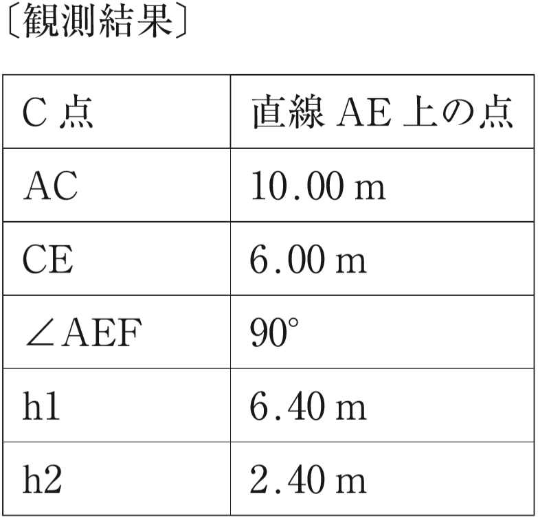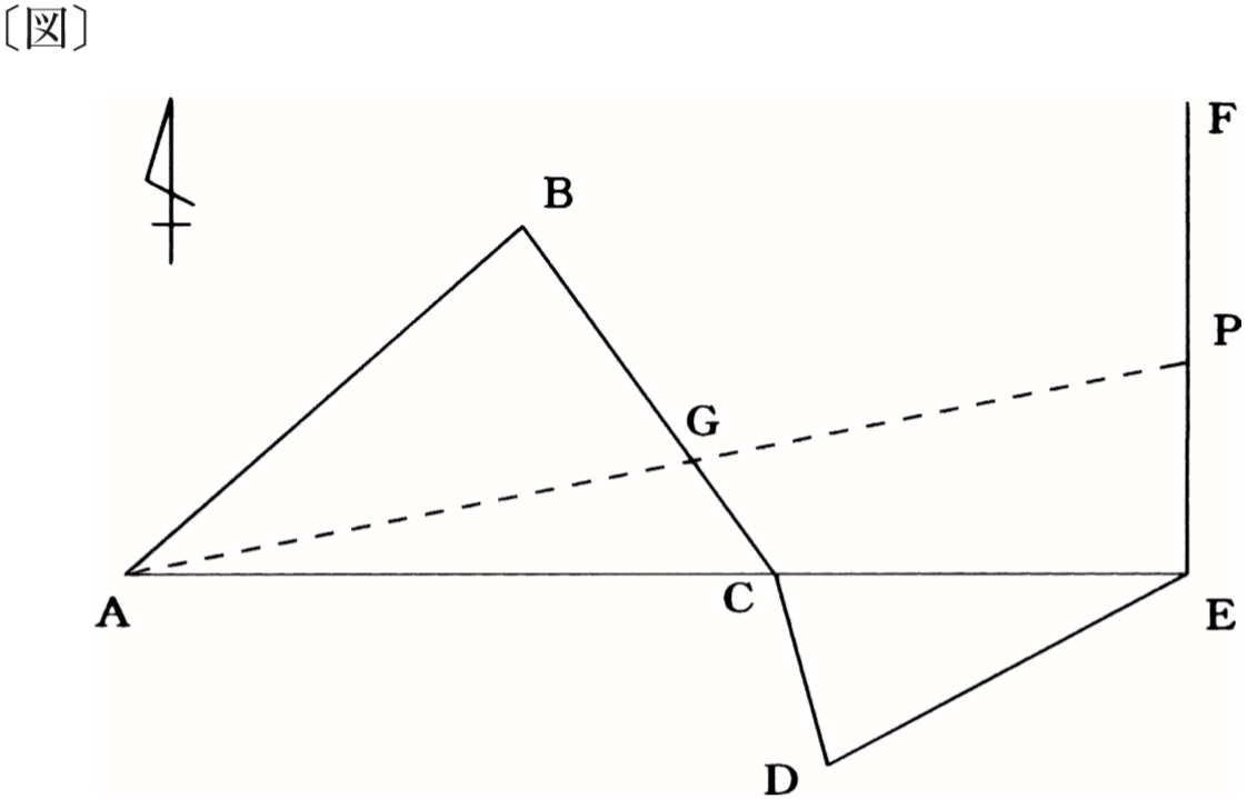 次の〔図〕のとおり,A点から順次,B 点,C 点,D 点,E 点及びF 点を結んだ線について,次の〔観測結果〕のとおりの結果を得た。三角形 ABG の面積と五角形 GCDEPの面積が等しくなるように直線 EF上の P 点を設置した場合に,