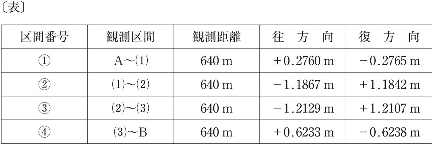 ただし,A 点から B 点までの高低差は,-1.5000 m であることが分かっている。また,片道の観測距離をSkm とするとき,往復観測値の較差の許容範囲は 2.5 mm