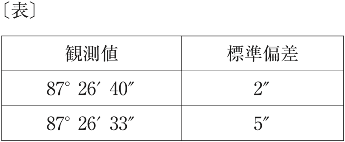 水平角の観測を行ったところ,次の〔表〕のとおりの結果を得た。この結果から求められる